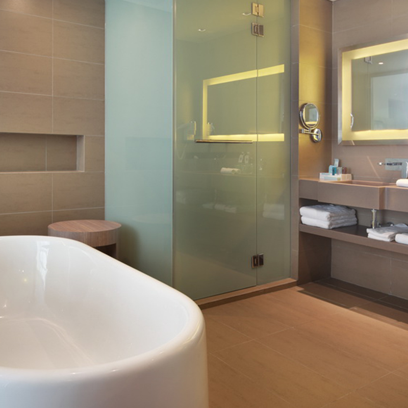 a divider between the bedroom and the bathtub with an electric frosted glass control